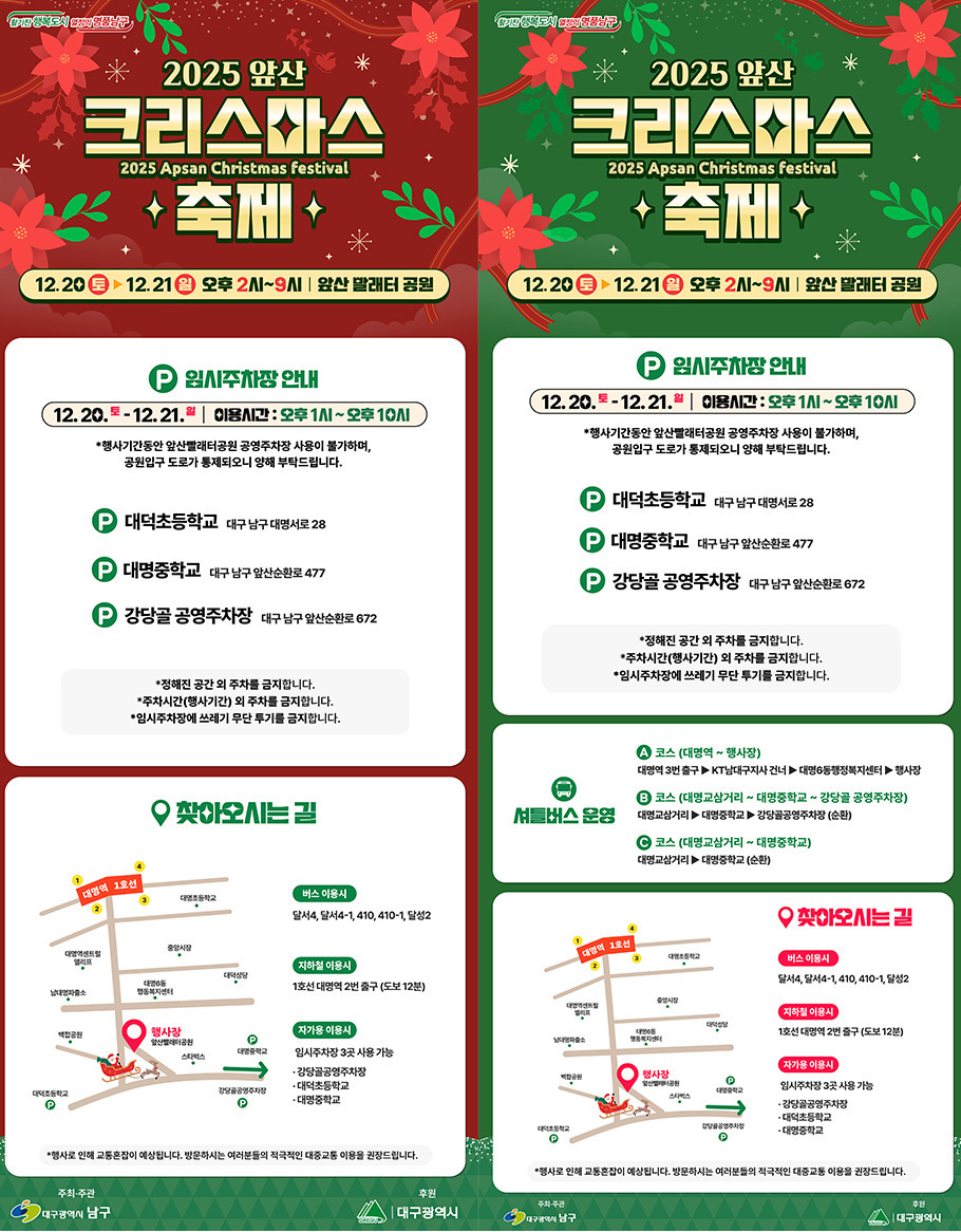 대구 남구가 주최한 ‘2025 앞산 크리스마스 축제’가 12월 20일(토)부터 21일(일)까지 앞산빨래터공원